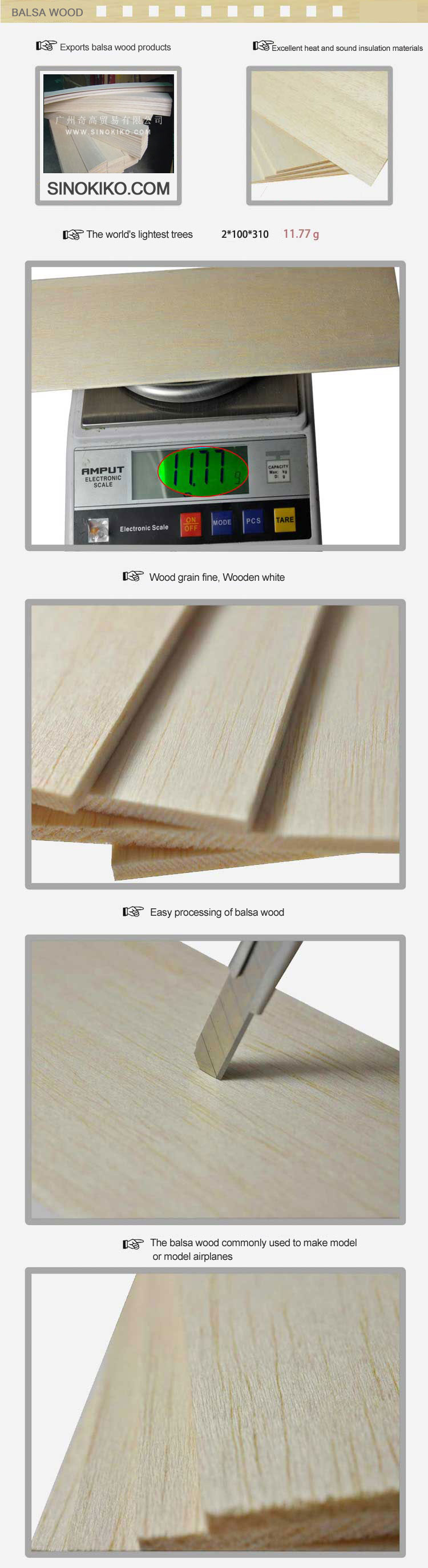 The balsa purposes: light wooden sailing ships, aircraft model, balsa surfboards, fishing gear, supplies, film and television props, military model, light wooden puzzle board, balsa wood souvenirs, collectibles, and other areas.